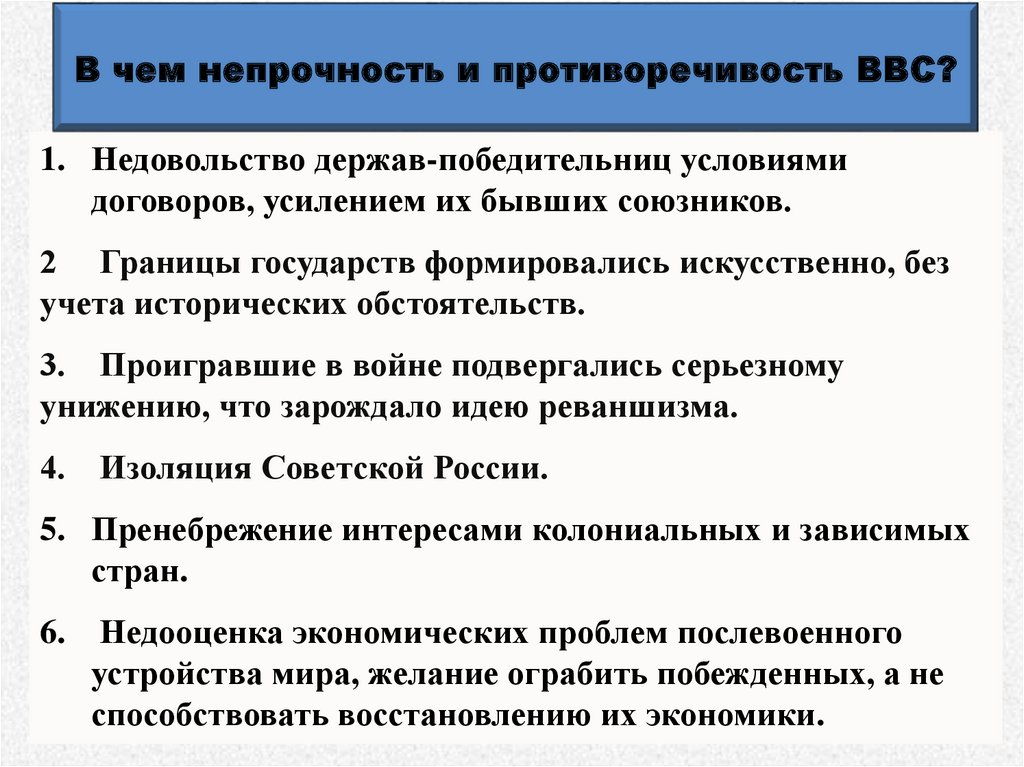 В чем непрочность и противоречивость ВВС?1. Недовольство держав-победительниц условиями