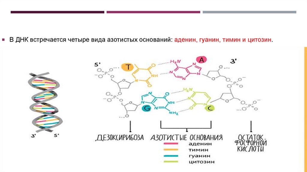 В ДНК встречается четыре вида азотистых оснований: аденин, гуанин, тимин и цитозин.12.