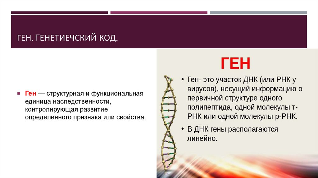 ГЕН. ГЕНЕТИЕЧСКИЙ КОД.Ген — структурная и функциональная