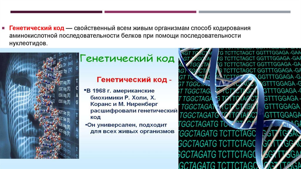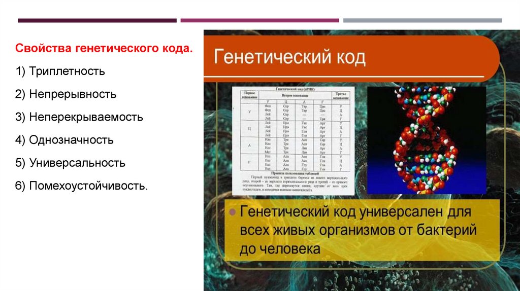 Генетический код — свойственный всем живым организмам способ кодированияаминокислотной последовательности белков при помощи последовательности