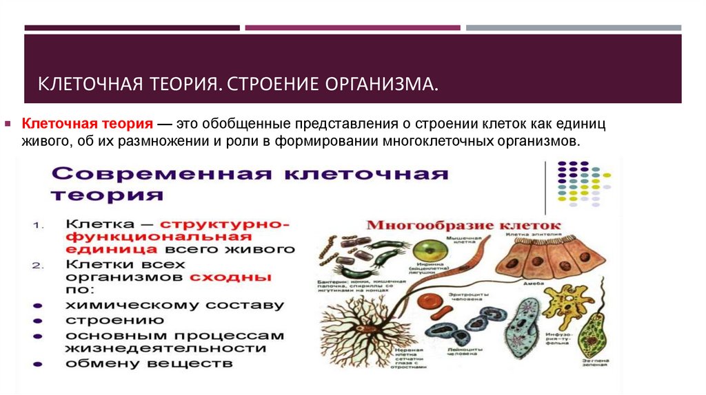 КЛЕТОЧНАЯ ТЕОРИЯ. СТРОЕНИЕ ОРГАНИЗМА.Клеточная теория — это обобщенные представления о строении клеток как единиц