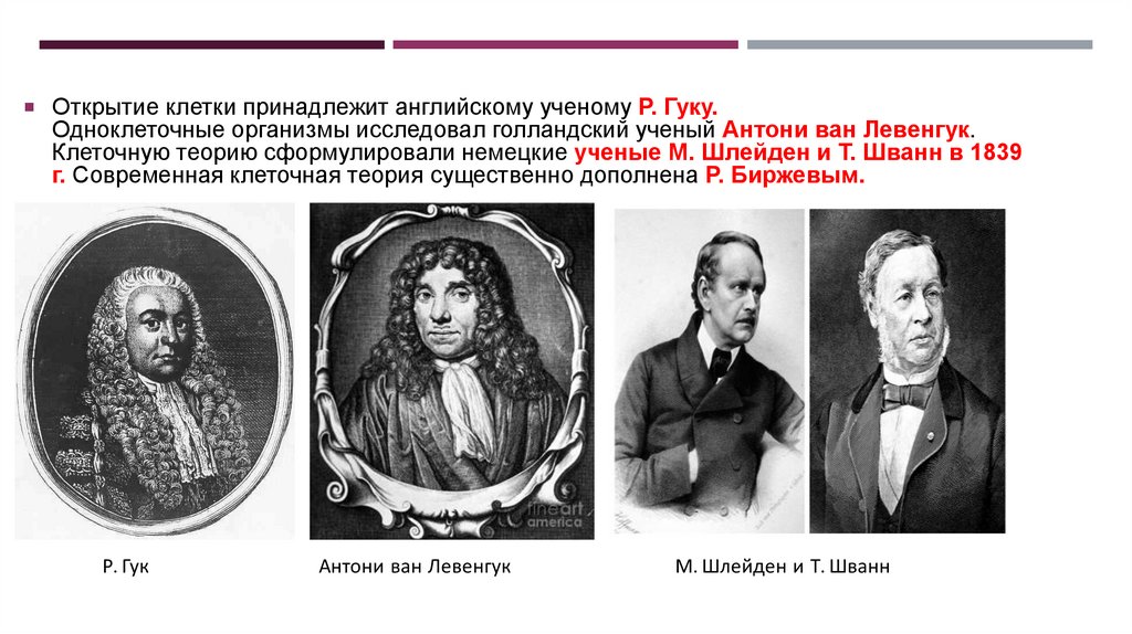 Открытие клетки принадлежит английскому ученому Р. Гуку.Одноклеточные организмы исследовал голландский ученый Антони ван Левенгук.