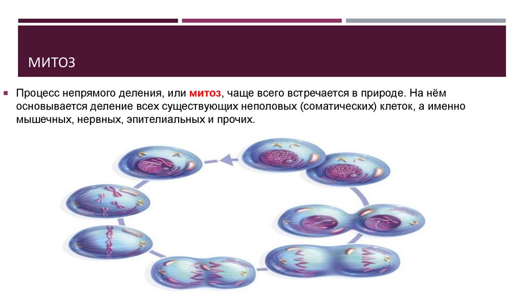 МИТОЗПроцесс непрямого деления, или митоз, чаще всего встречается в природе. На нём