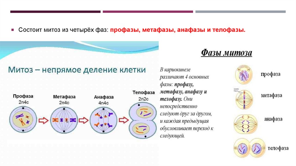 Состоит митоз из четырёх фаз: профазы, метафазы, анафазы и телофазы.25.