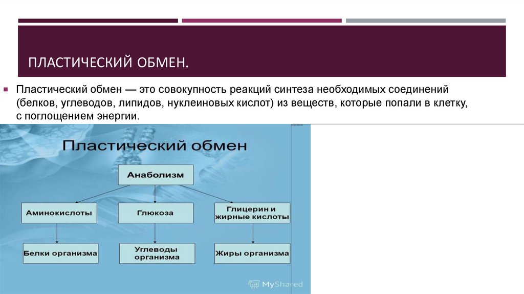 ПЛАСТИЧЕСКИЙ ОБМЕН.Пластический обмен — это совокупность реакций синтеза необходимых соединений