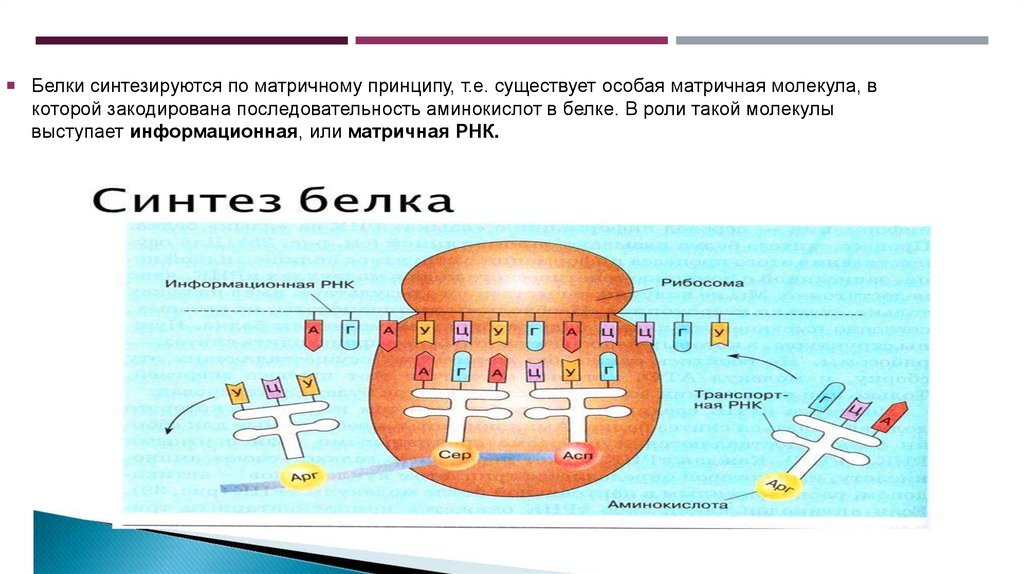 Белки синтезируются по матричному принципу, т.е. существует особая матричная молекула, вкоторой закодирована последовательность аминокислот в белке. В роли такой молекулы