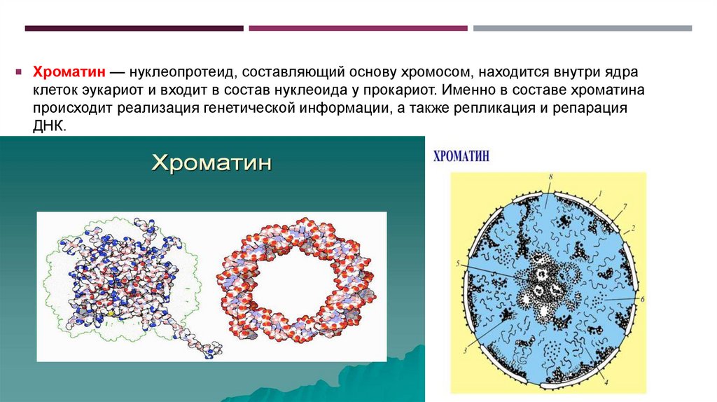 Хроматин — нуклеопротеид, составляющий основу хромосом, находится внутри ядраклеток эукариот и входит в состав нуклеоида у прокариот. Именно в составе хроматина