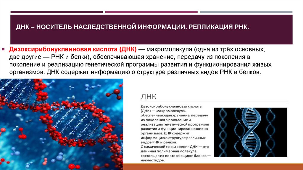 ДНК – НОСИТЕЛЬ НАСЛЕДСТВЕННОЙ ИНФОРМАЦИИ. РЕПЛИКАЦИЯ РНК.Дезоксирибонуклеиновая кислота (ДНК) — макромолекула (одна из трёх основных,