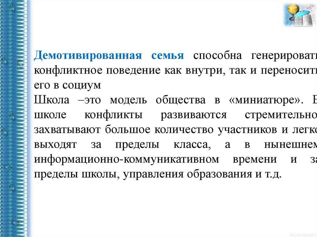 Демотивированная семья способна генерироватьконфликтное поведение как внутри, так и переносить
