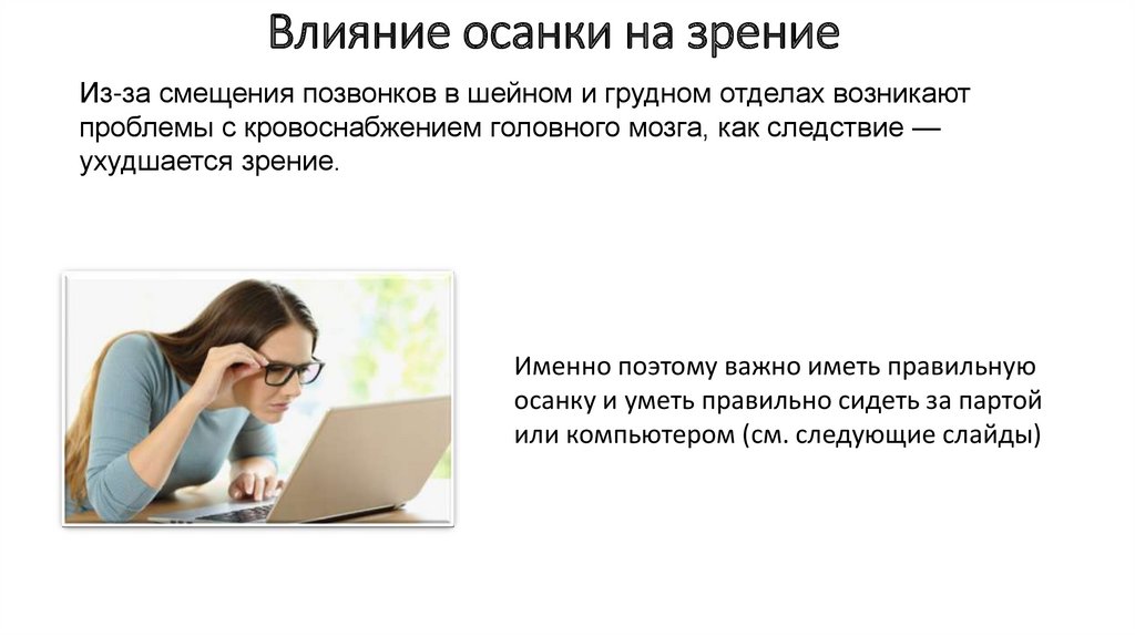 Влияние осанки на зрениеИз-за смещения позвонков в шейном и грудном отделах возникают