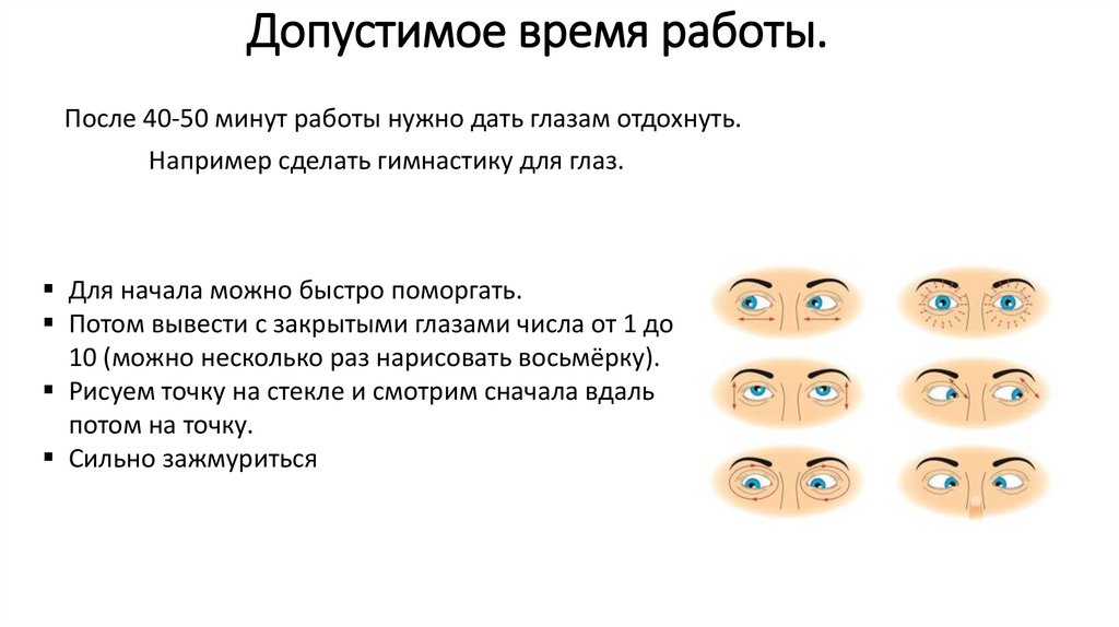Допустимое время работы.После 40-50 минут работы нужно дать глазам отдохнуть.