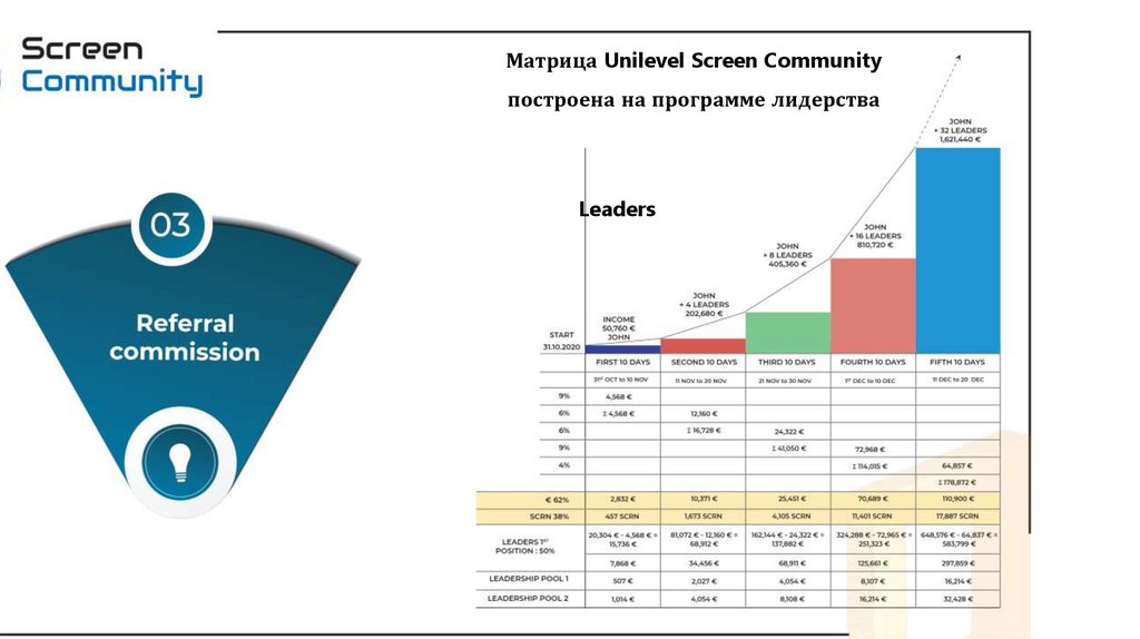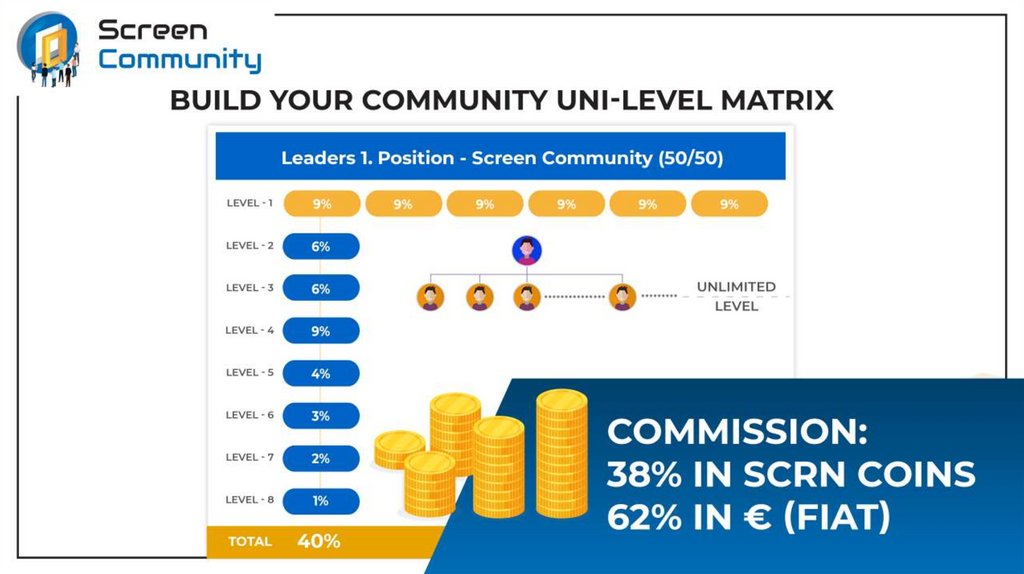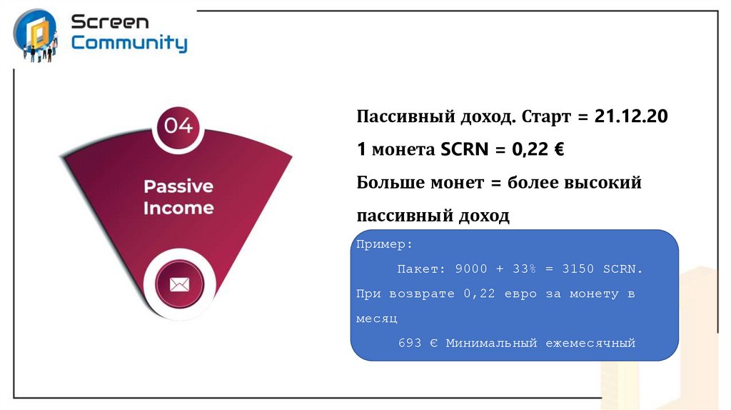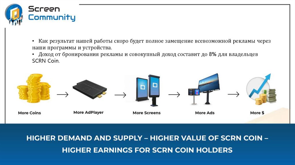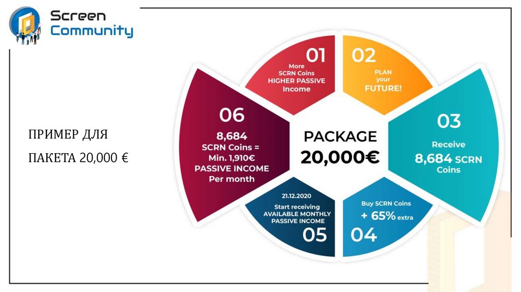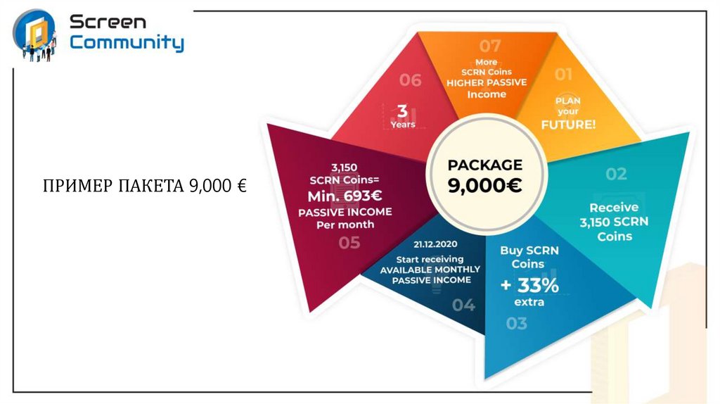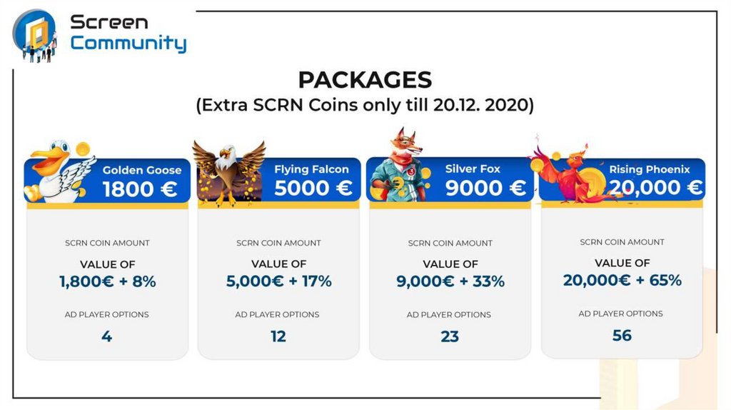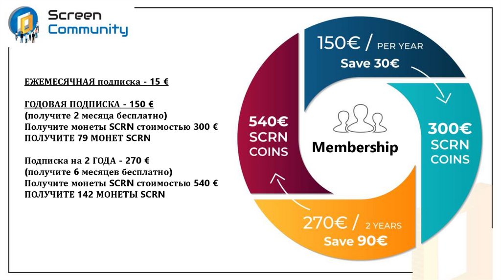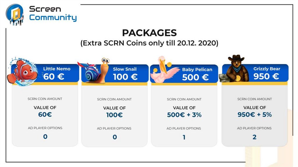 • Через инвестирование с пакеты, происходит инвестирование в Screen community,