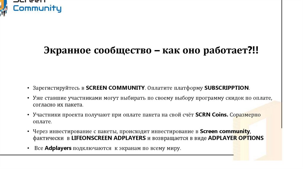 Экранное сообщество – как оно работает?!!• Зарегистируйтесь в SCREEN COMMUNITY. Оплатите платформу SUBSCRIPPTION.