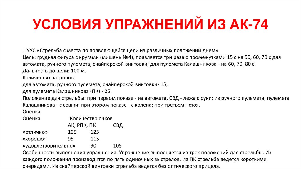 УСЛОВИЯ УПРАЖНЕНИЙ ИЗ АК-741 УУС «Стрельба с места по появляющейся цели из различных положений днем»