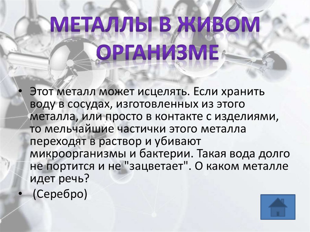 • Этот металл может исцелять. Если хранитьводу в сосудах, изготовленных из этого