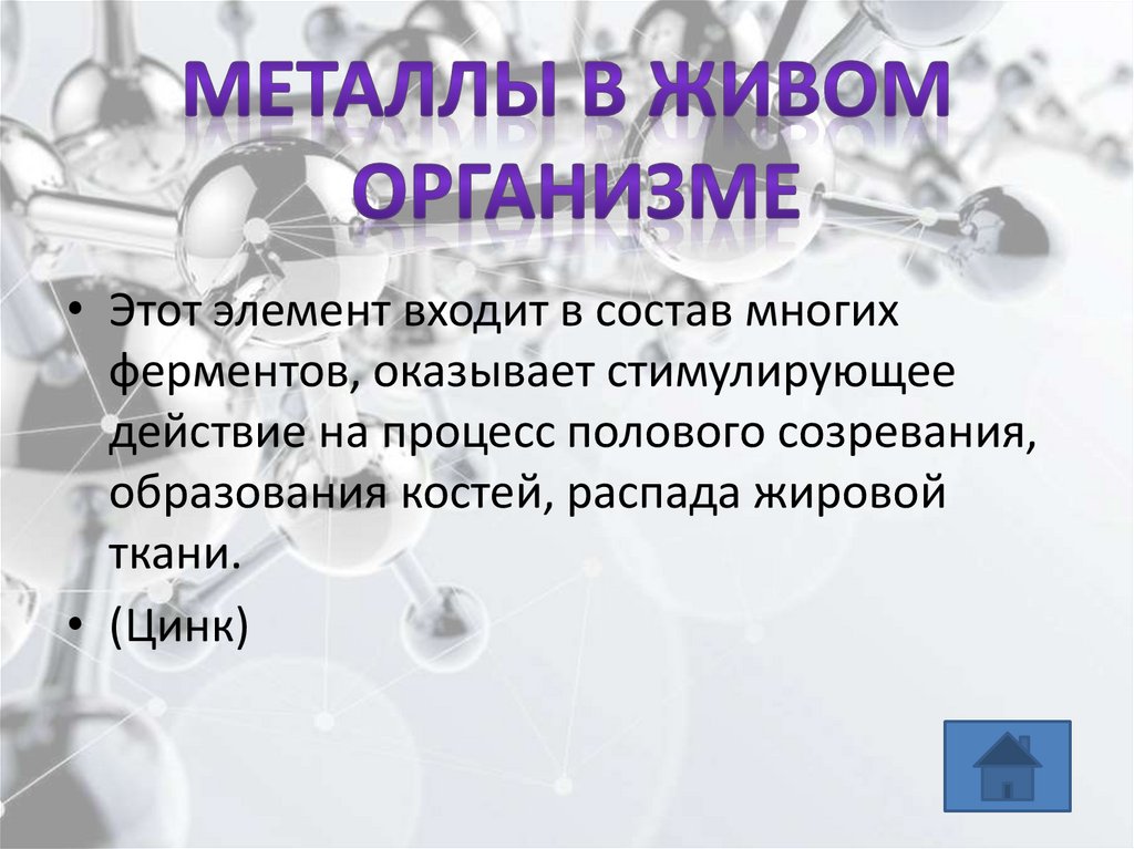 • Этот элемент входит в состав многихферментов, оказывает стимулирующее