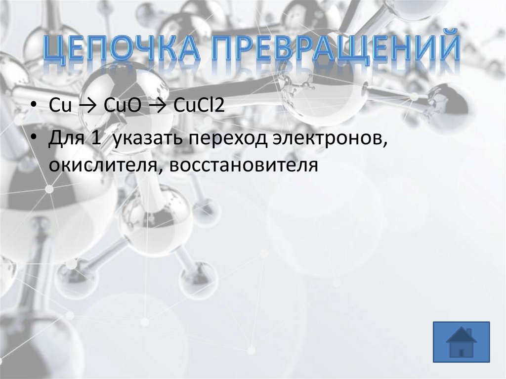 • Сu → CuO → CuCl2• Для 1 указать переход электронов,