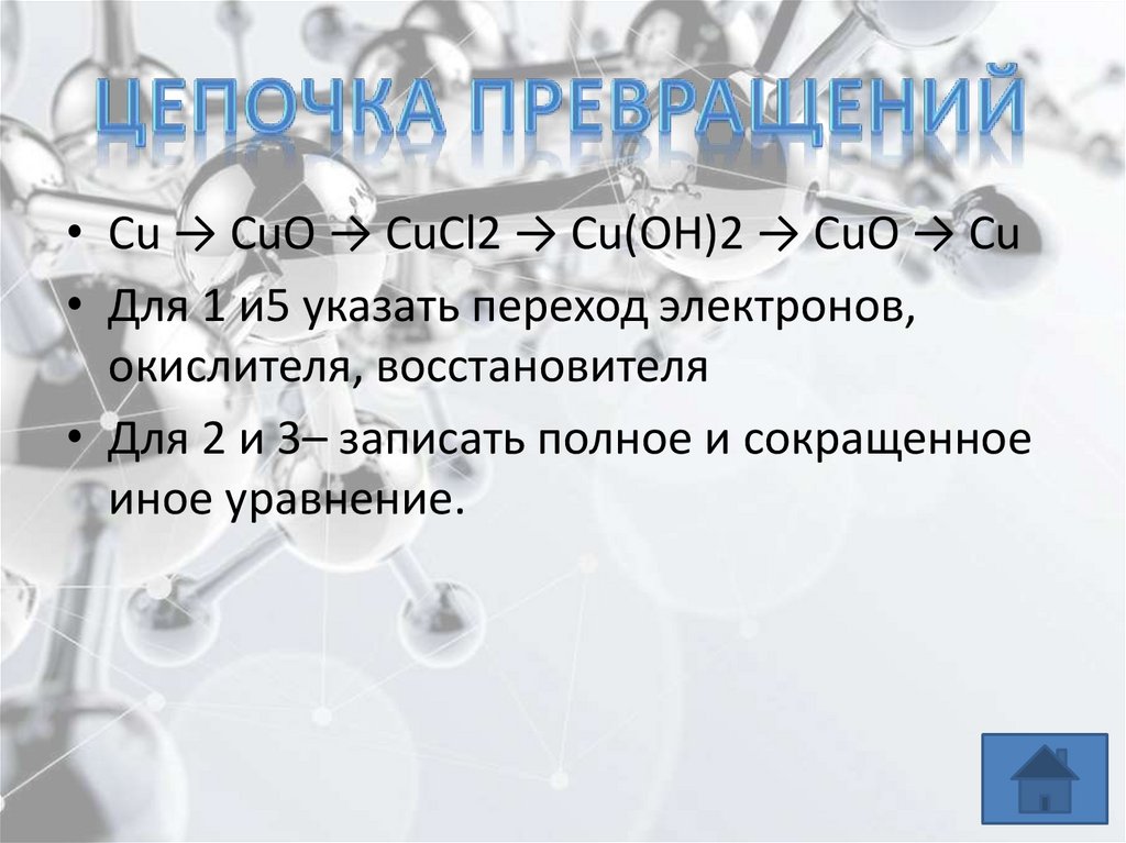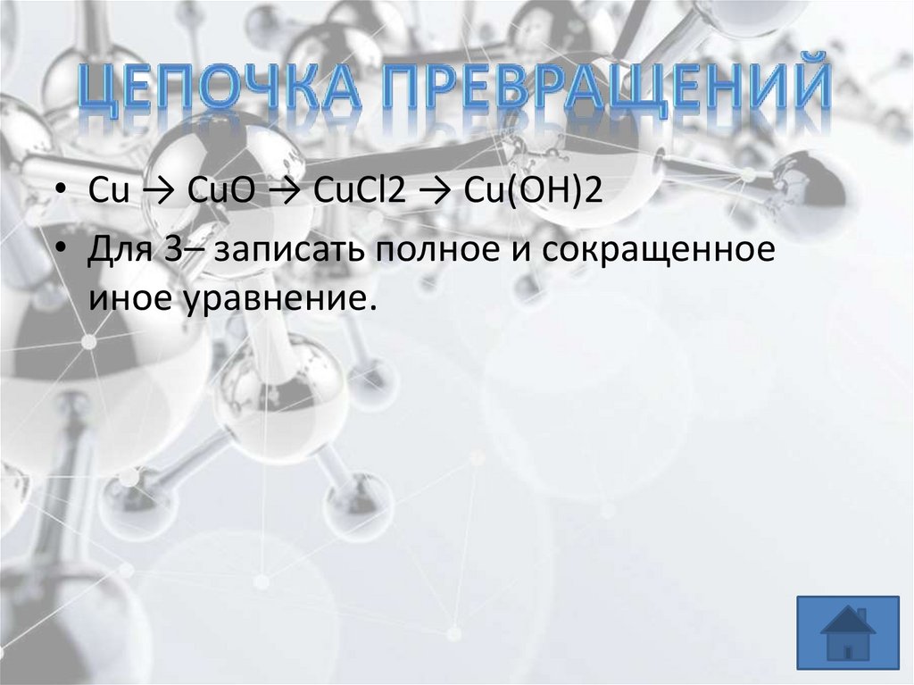 • Сu → CuO → CuCl2 → Cu(OH)2• Для 3– записать полное и сокращенное