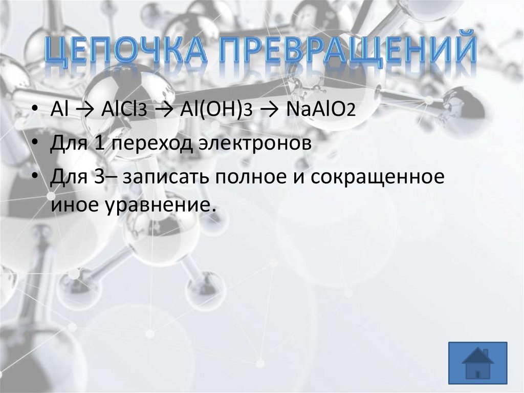 • Аl → AlCl3 → Al(OH)3 → NaAlO2• Для 1 переход электронов