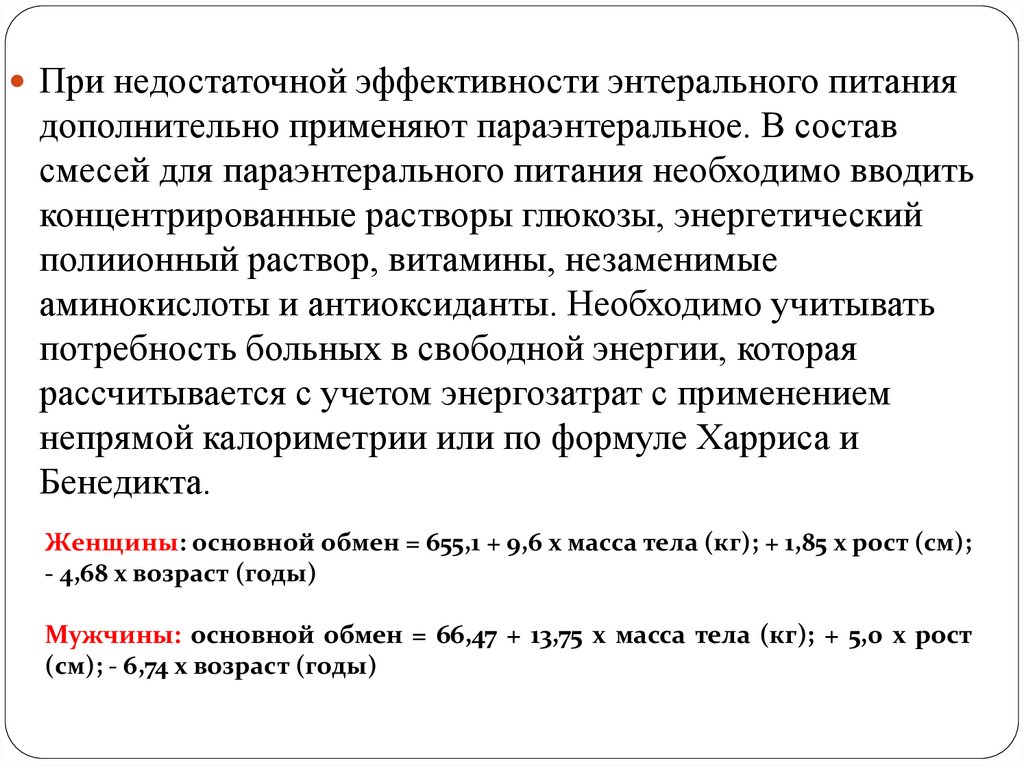При недостаточной эффективности энтерального питаниядополнительно применяют параэнтеральное. В состав