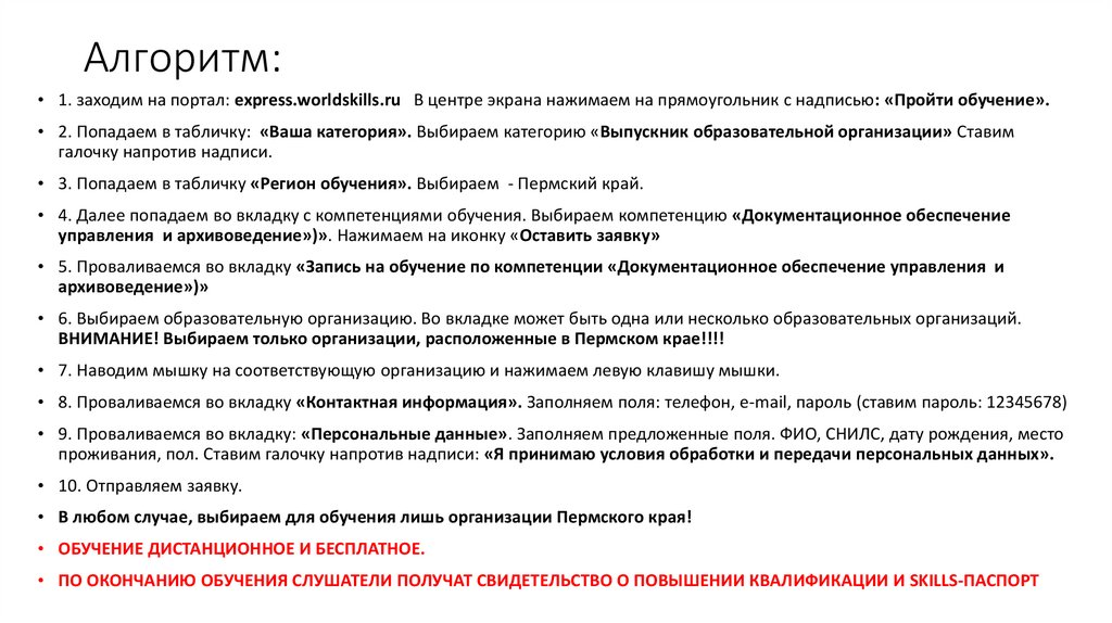 Алгоритм:• 1. заходим на портал: express.worldskills.ru В центре экрана нажимаем на прямоугольник с надписью: «Пройти обучение».