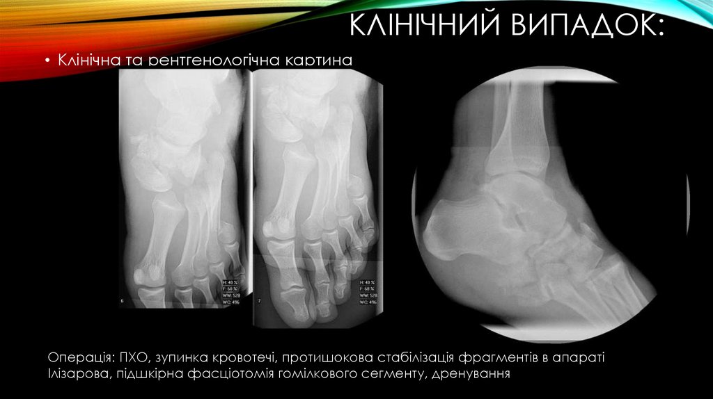 Операція: ПХО, зупинка кровотечі, протишокова стабілізація фрагментів в апараті