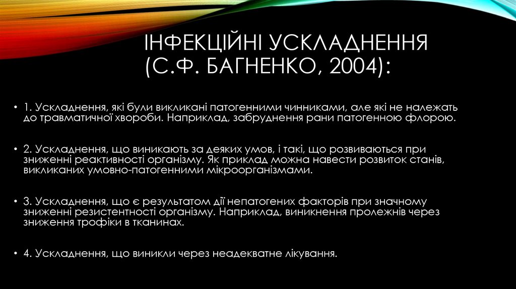 ІНФЕКЦІЙНІ УСКЛАДНЕННЯ(С.Ф. БАГНЕНКО, 2004):