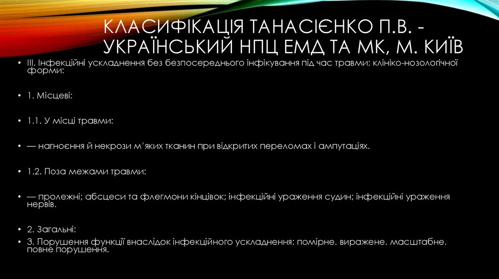 КЛАСИФІКАЦІЯ ТАНАСІЄНКО П.В. УКРАЇНСЬКИЙ НПЦ ЕМД ТА МК, М. КИЇВ• ІІІ. Інфекційні ускладнення без безпосереднього інфікування під час травми: клініко-нозологічної