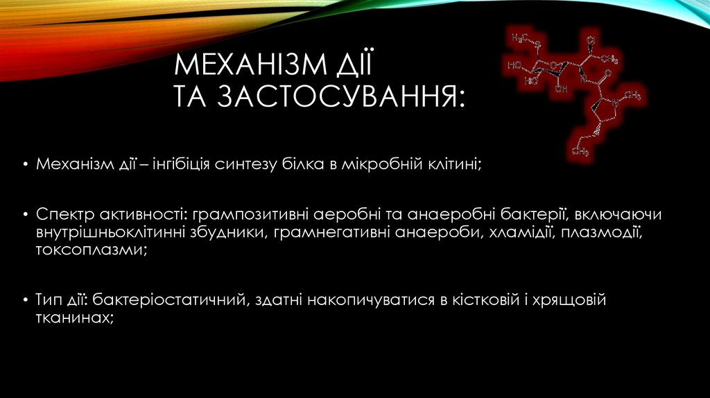 • Механізм дії – інгібіція синтезу білка в мікробній клітині;