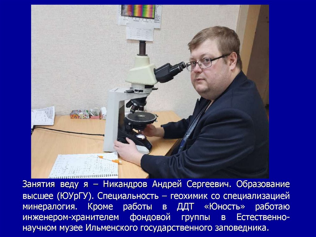 Занятия веду я – Никандров Андрей Сергеевич. Образованиевысшее (ЮУрГУ). Специальность – геохимик со специализацией