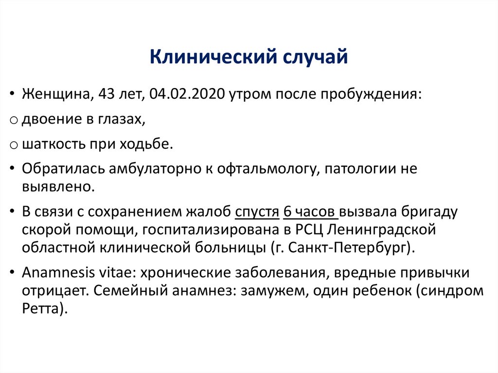 Клинический случай• Женщина, 43 лет, 04.02.2020 утром после пробуждения: