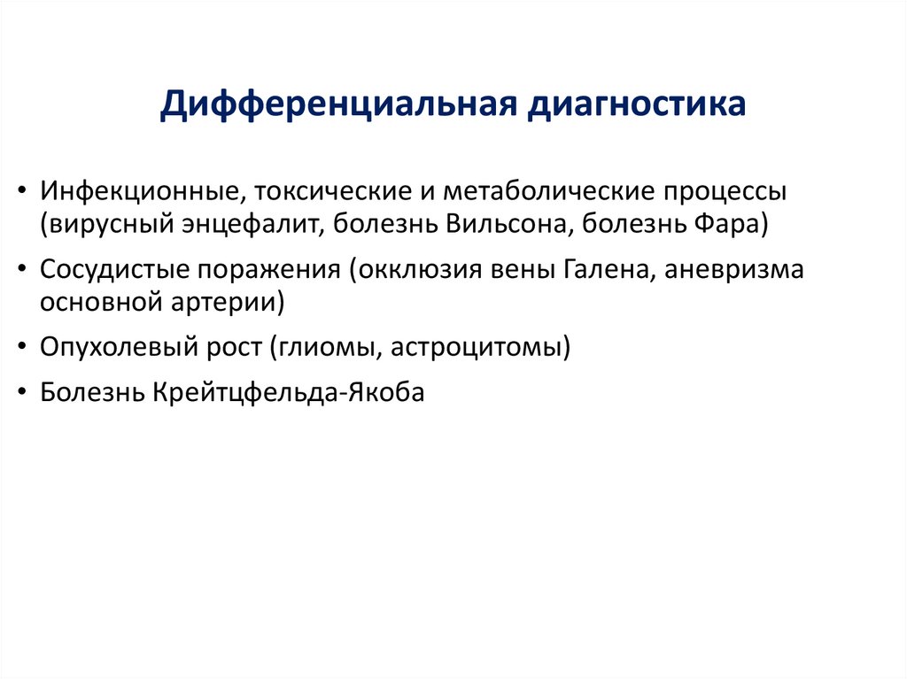 (вирусный энцефалит, болезнь Вильсона, болезнь Фара)