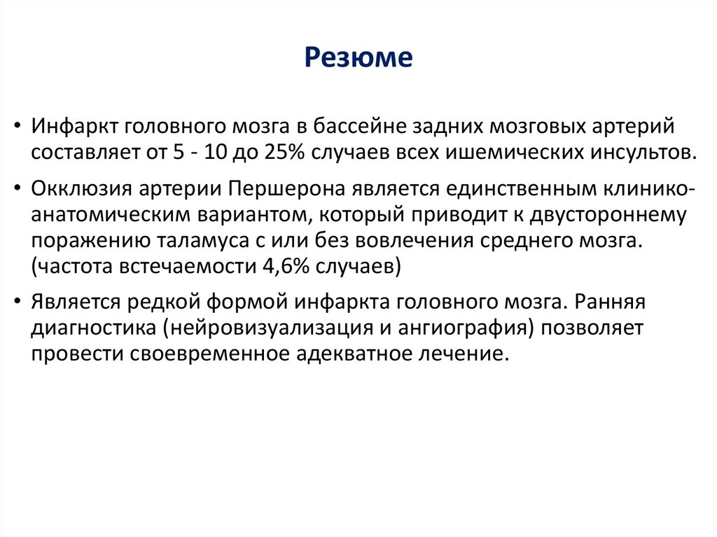 Резюме• Инфаркт головного мозга в бассейне задних мозговых артерий