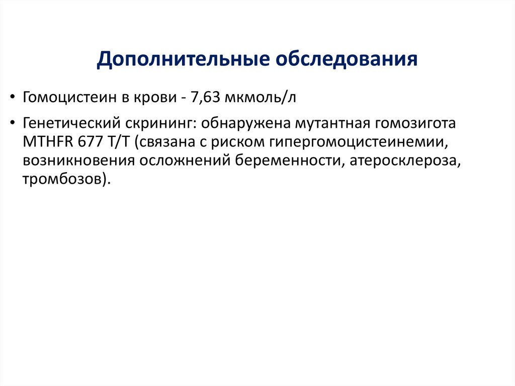 Дополнительные обследования• Гомоцистеин в крови - 7,63 мкмоль/л