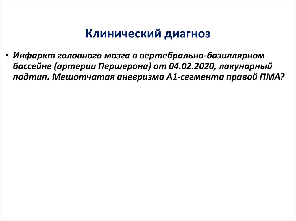 Клинический диагноз• Инфаркт головного мозга в вертебрально-базиллярном