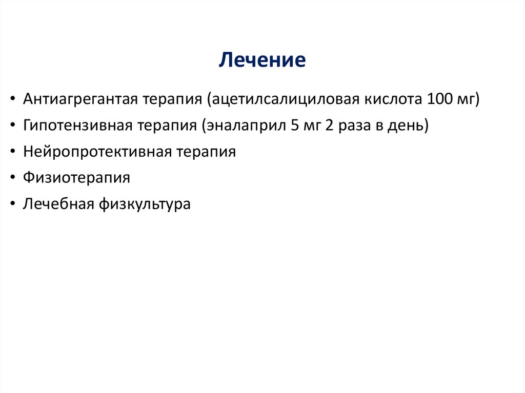 ЛечениеАнтиагрегантая терапия (ацетилсалициловая кислота 100 мг)