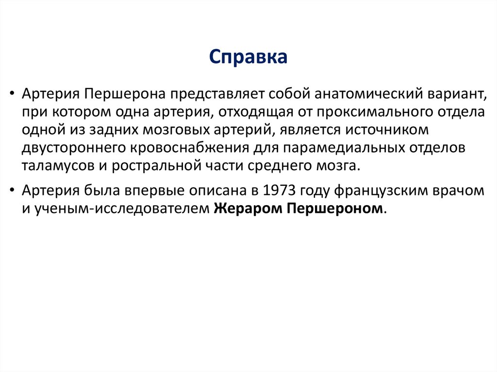 Справка• Артерия Першерона представляет собой анатомический вариант,