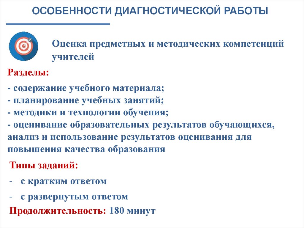 ОСОБЕННОСТИ ДИАГНОСТИЧЕСКОЙ РАБОТЫОценка предметных и методических компетенций