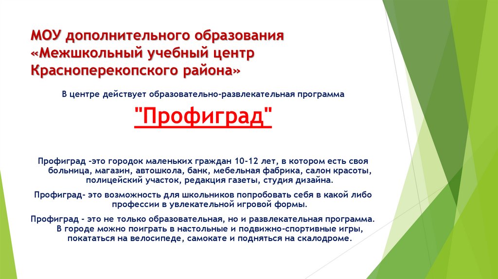 Профиград -это городок маленьких граждан 10-12 лет, в котором есть своя