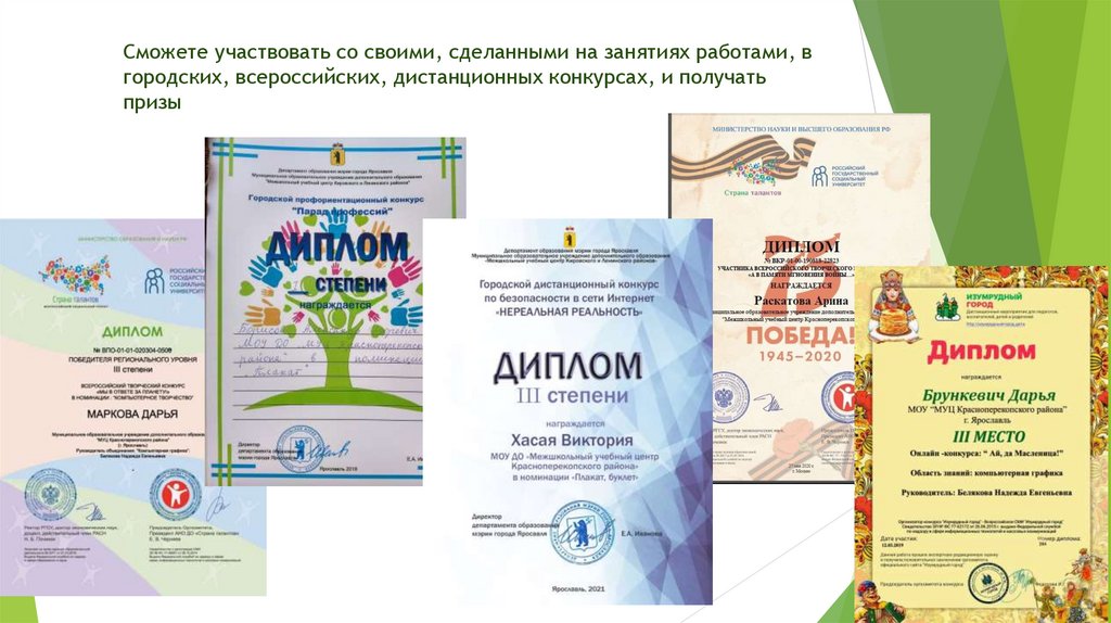 Сможете участвовать со своими, сделанными на занятиях работами, вгородских, всероссийских, дистанционных конкурсах, и получать