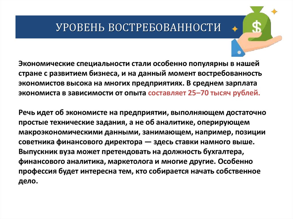 УРОВЕНЬ ВОСТРЕБОВАННОСТИЭкономические специальности стали особенно популярны в нашей