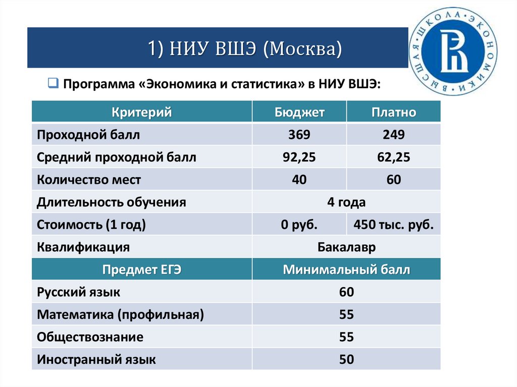 1) НИУ ВШЭ (Москва)Программа «Экономика и статистика» в НИУ ВШЭ: