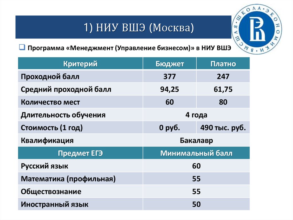 1) НИУ ВШЭ (Москва)Программа «Менеджмент (Управление бизнесом)» в НИУ ВШЭ: