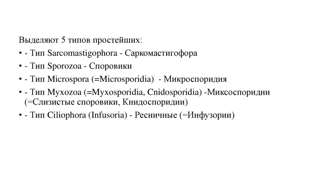 Выделяют 5 типов простейших:• - Тип Sarcomastigophora - Саркомастигофора