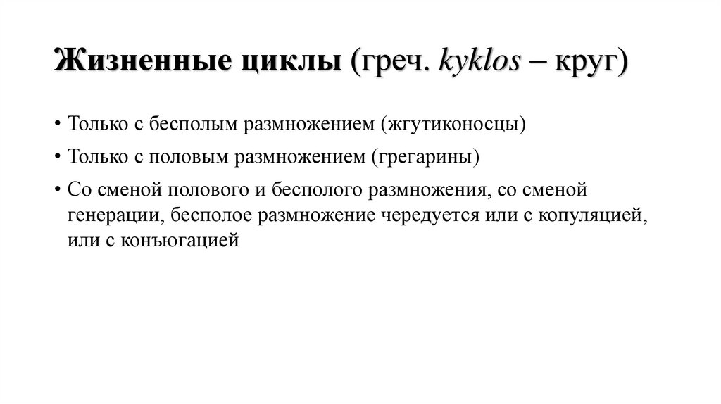 Жизненные циклы (греч. kyklos – круг)• Только с бесполым размножением (жгутиконосцы)