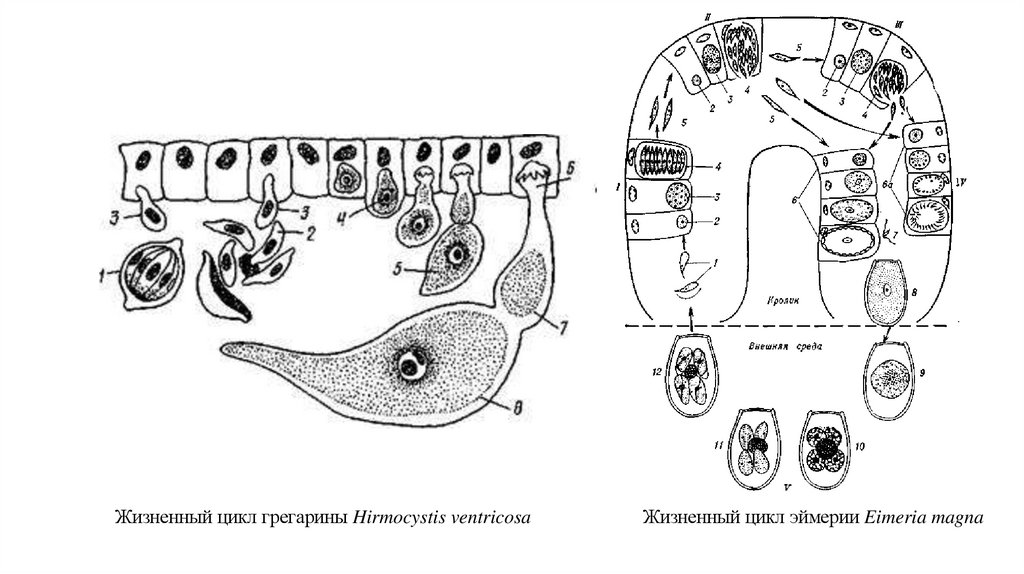Жизненный цикл грегарины Hirmocystis ventricosaЖизненный цикл эймерии Eimeria magna