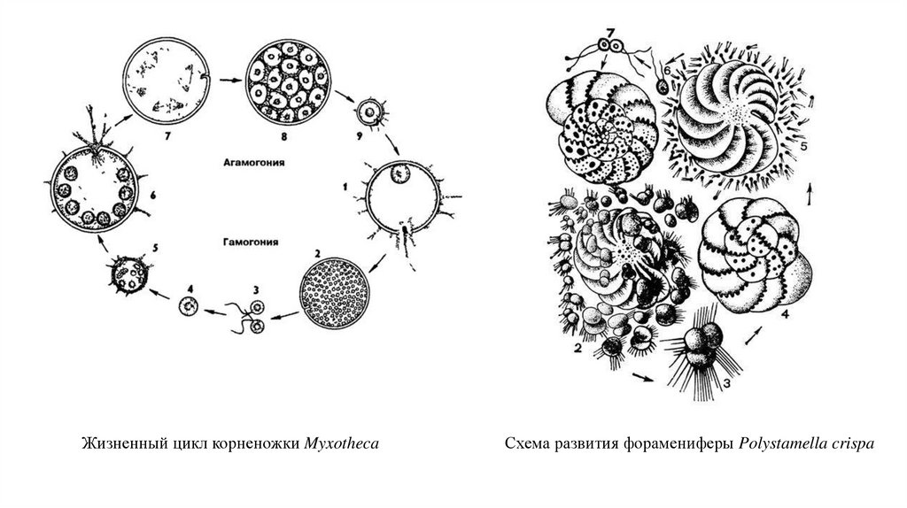 Жизненный цикл корненожки MyxothecaСхема развития форамениферы Polystamella crispa