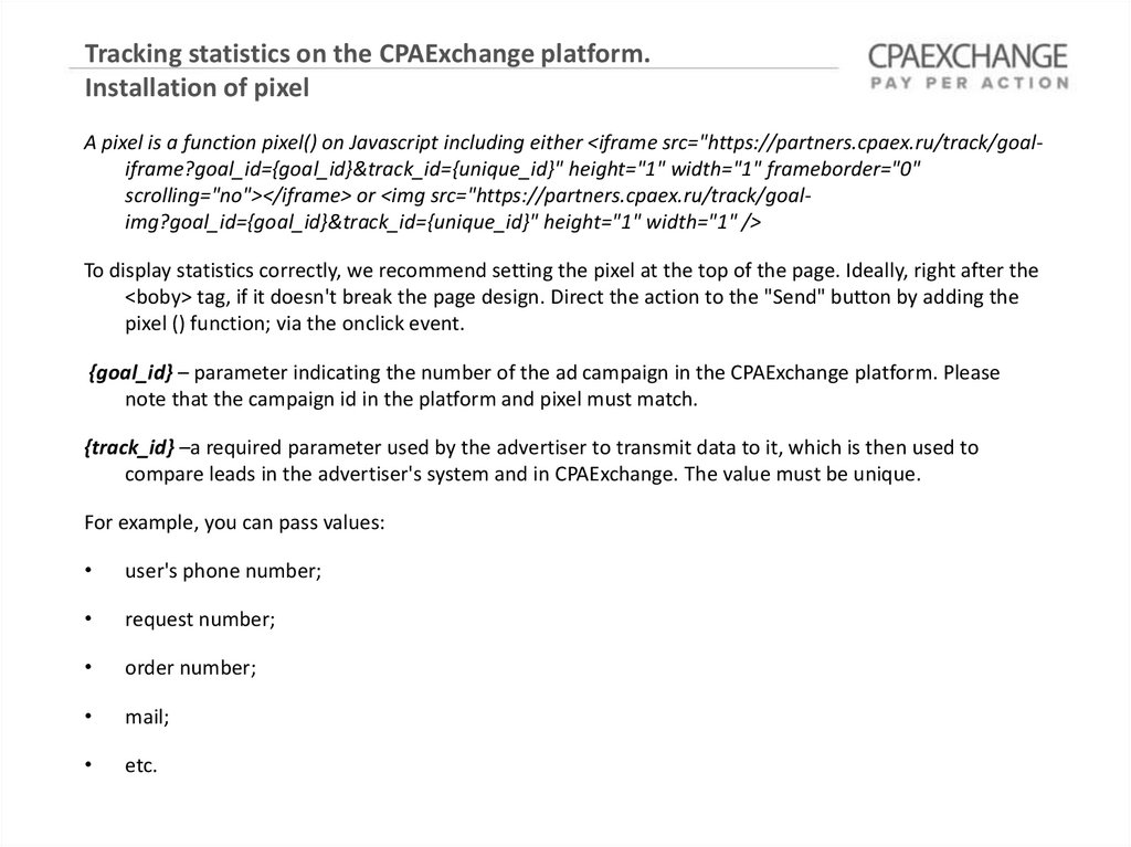 A pixel is a function pixel() on Javascript including either <iframe src="https://partners.cpaex.ru/track/goaliframe?goal_id={goal_id}&track_id={unique_id}" height="1" width="1" frameborder="0"