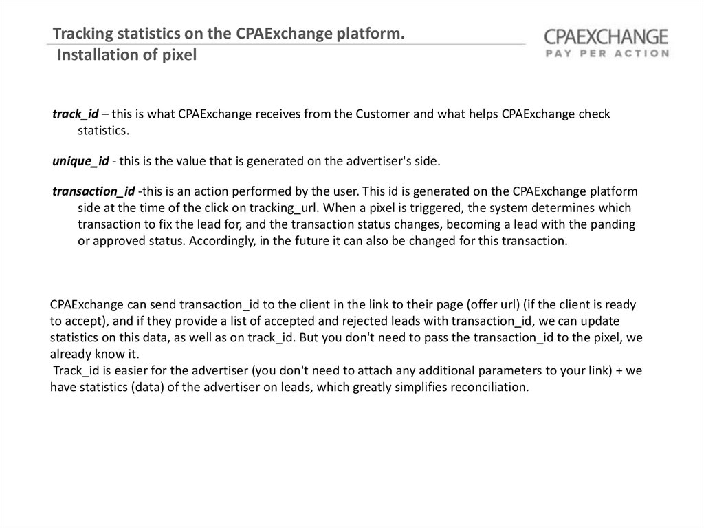 track_id – this is what CPAExchange receives from the Customer and what helps CPAExchange check