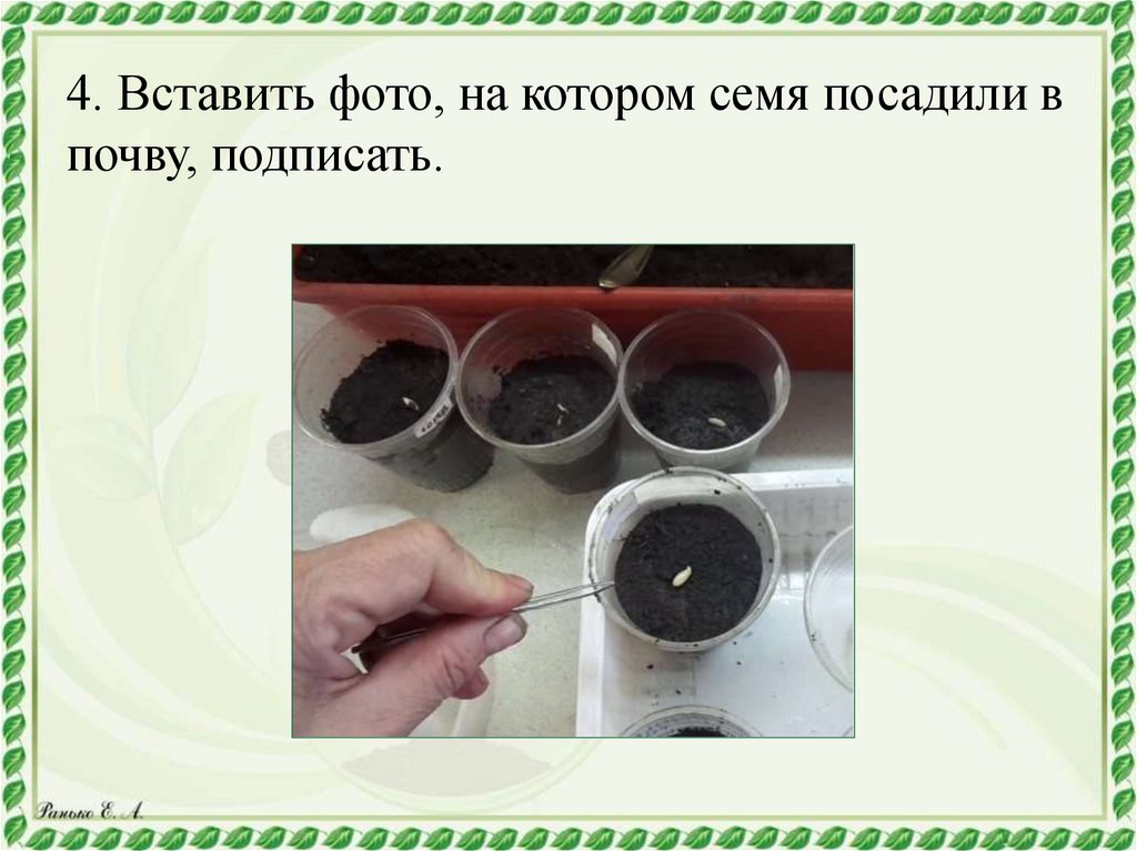 4. Вставить фото, на котором семя посадили впочву, подписать.